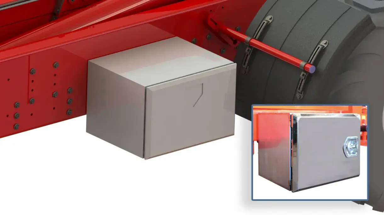 Das Modell kann mit einem Werkzeugkasten aus Edelstahl ausgestattet werden. Abschließbar mit einem Schlüssel.