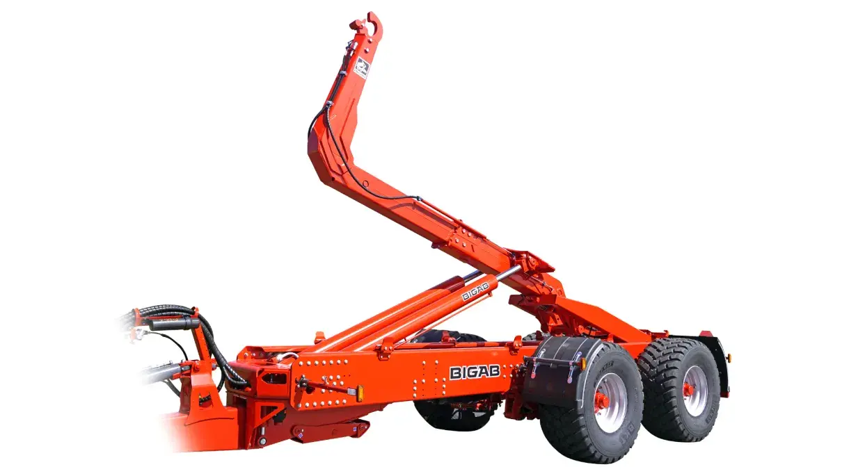 Starke Leistung, einfache Konstruktion und akzeptabler Preis - das sind die Eigenschaften, die den BIGAB 20-24 auszeichnen. Dieser Anhänger erfüllt Ihre besonders schweren Transportaufgaben, vom Kiestransport bis zur Einbringung der Ernte. Der Anhänger kann an LKWs angehangen werden, ist mit einem soliden Pendelfahrwerk ausgerüstet und wird auf Wunsch mit verschiedenen optionalen Federungsalternativen geliefert. Die große Bandbreite möglicher Radoptionen garantiert, dass Ihre individuellen Anforderungen exakt erfüllt werden. Zur Standardausstattung des Anhängers gehören weiterhin: die hydraulische Ansteuerung des Kipp- und Auf-/Absetzbetriebs, eine hydraulische Fahrwerkssperre, Halbkotflügel vorn und hinten sowie ein elektrisch angesteuertes Ventil für die Hydraulikfunktionen (Druck und freier Rücklauf) mit Steuerpult im Fahrerhaus für die einfache Steuerung aller Anhängerfunktionen und freie Kapazitäten für zwei Zusatzfunktionen. Das Hakenliftsystem umfasst einen verschiebbaren Hakenarm für Container mit einer Länge zwischen 5500-6500mm.
