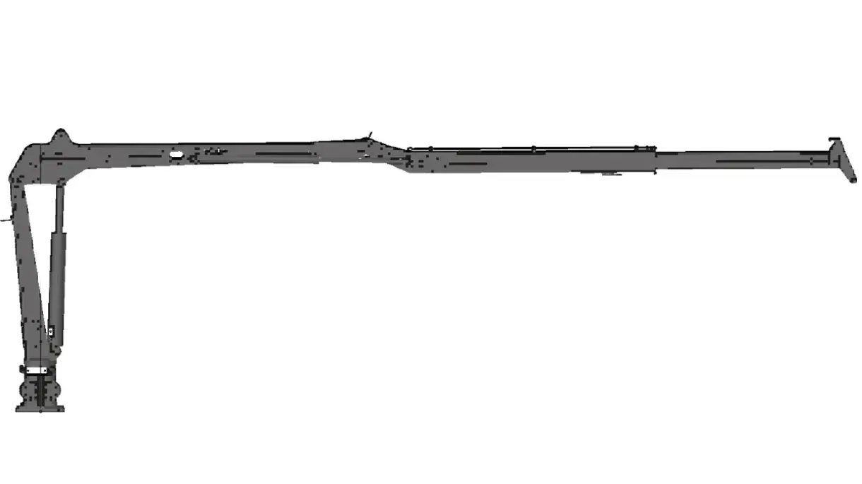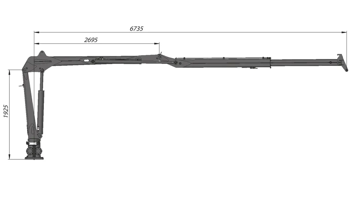The Z-crane has a reach of 6,6 m with a single telescope of 1,45 m. At full length, the crane can lift 750kg excl. grapple and rotator.