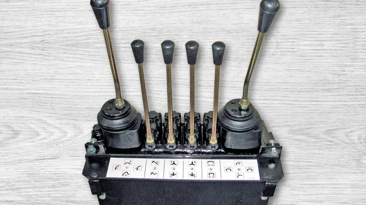 The valve assemblies appear similar at first glance, but differ significantly in weight and the number of levers. 2+3 levers are fully cast and 10 kilos lighter than the 2+4 levers, which are assembled with different components. On the 2+3 levers the support legs and grapple are controlled by the three centre levers. On the 2+4 levers model there is also an extension and therefore there are four levers in the middle. Illustrated is the 2+4 lever model.