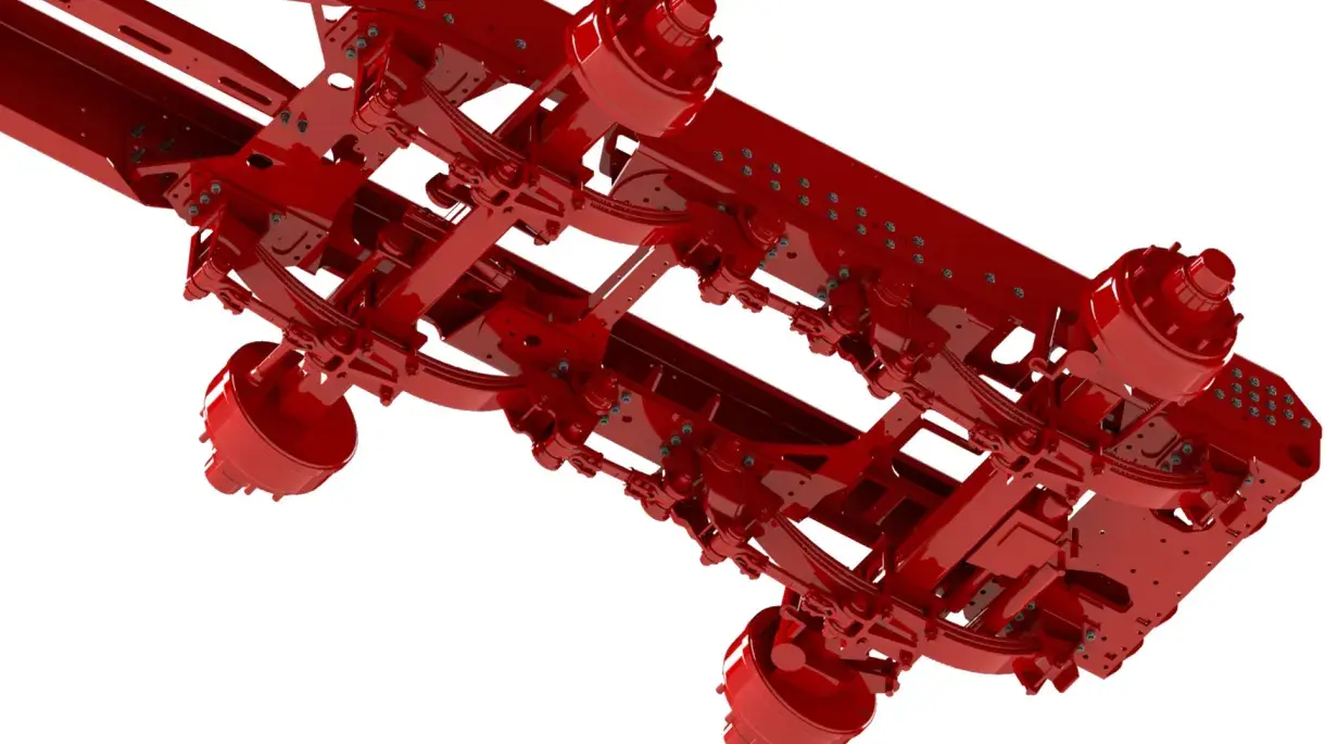 Tandem parabolic long bogie (1820 mm) is equipped with a suspension package on every axle and a link in between.  The suspension is offered with 1 rigid and 1 steered axle. The trailer runs amazingly soft and easy.