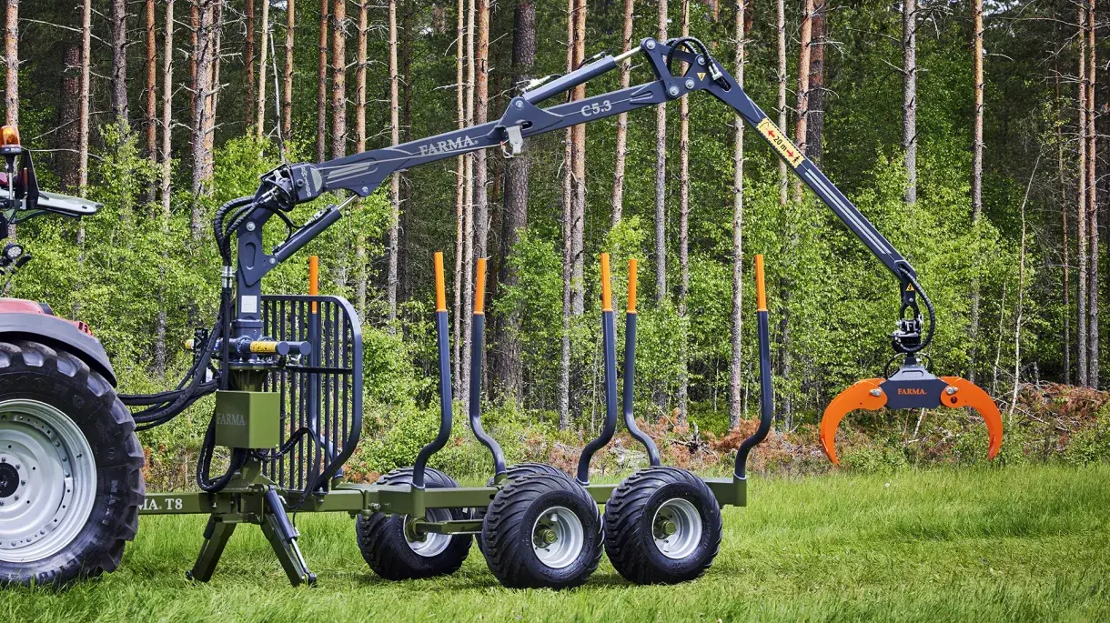 FARMA T8 is a robust lumber trailer with support legs well protected in front of the railing in uplifted position. The trailer is equipped with hydraulic flapdown support legs and 3 banks in the standard version. A lumber trailer model that suits many of our active forest owners. The illustration shows the old version of T8. The trailer has now been equipped with the same reinforced crane platform as T6. FARMA T8 can therefore be equipped with cranes up to C 6.3.