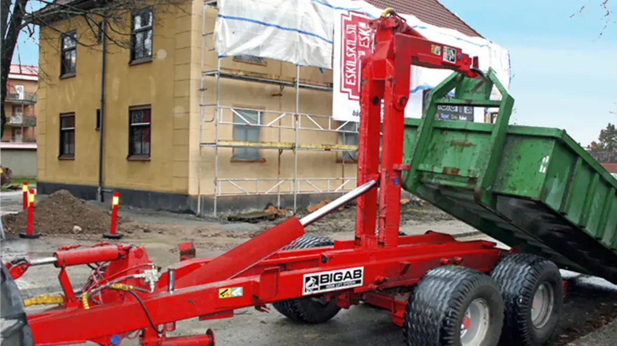 La BIGAB 14-17 mais elle représente le meilleur choix si vous avez besoin d'une version toute équipée, vous offrant ainsi un excellent retour sur investissement. Cette remorque constitue le choix le plus naturel pour le transport de charges lourdes sur de longues distances. Elle roule très bien même sur la route la plus mauvaise. La 14-17 est équipée de série d'un boggie pendulaire suspendu de 17 tonnes, d'un vérin de transfert de charge hydraulique, d'une commande hydraulique pour passer du mode basculement au mode échange, d'une soupape de commande électrique des fonctions hydrauliques (pression et retour libre) et d'un boîtier de commande dans la cabine pour une mise en œuvre aisée des fonctions. Il est en outre possible d'ajouter deux fonctions auxiliaires à double effet.