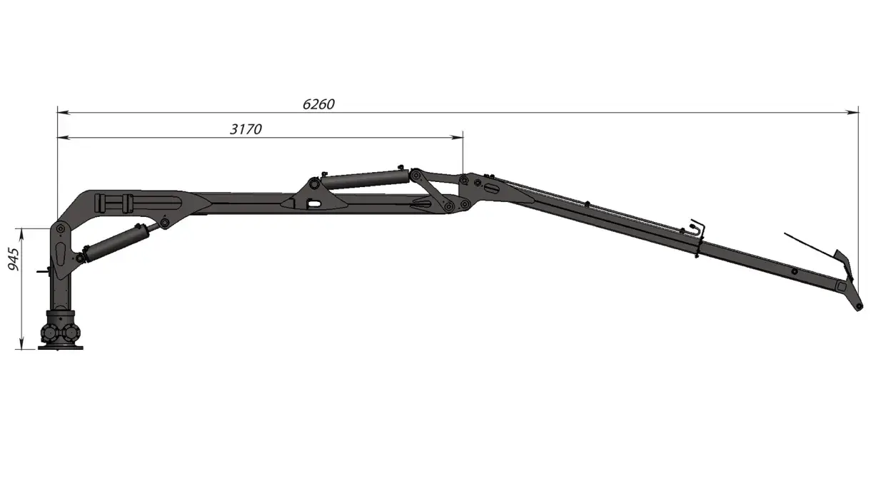 Kranen har en räckvidd på 6,3 m och ett utskjut på 1, 1 m. Kranen lyfter 500 kg på full räckvidd exkl. grip, rotator och länk.