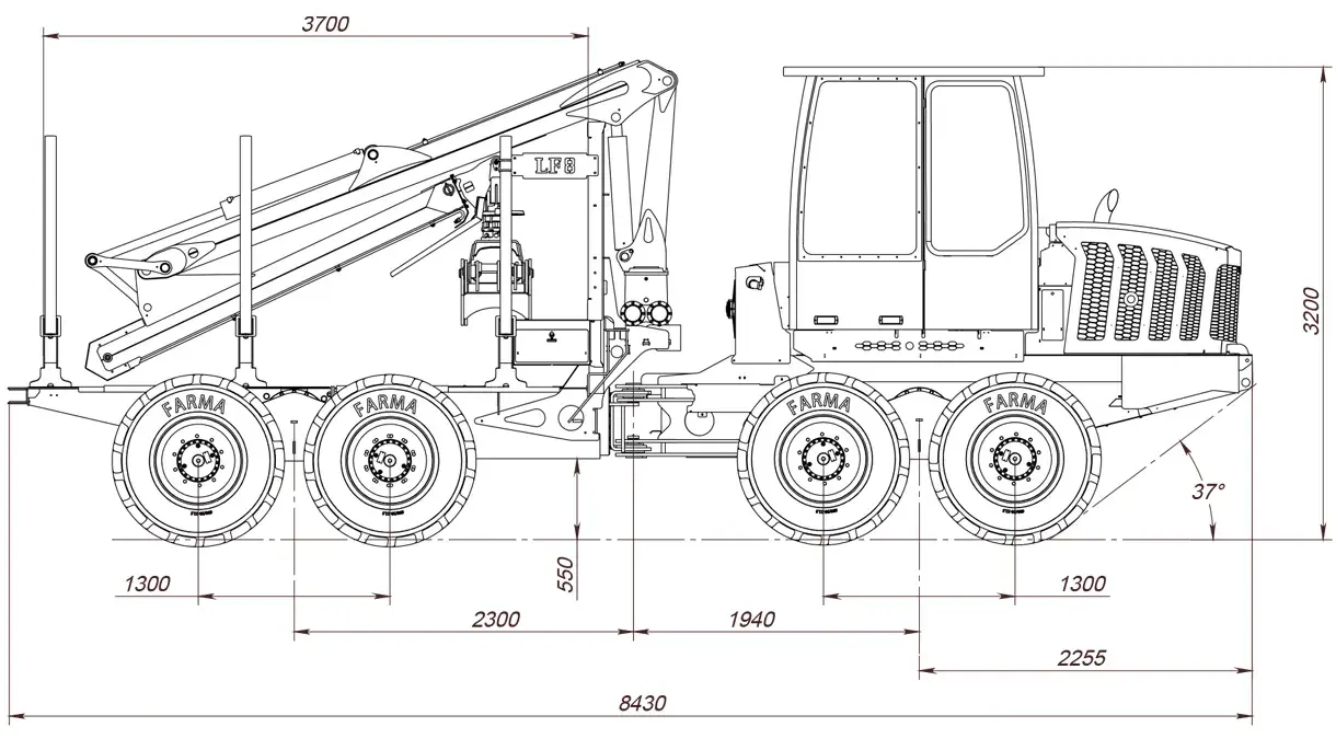 FARMA LF8, en kompakt 8-hjulig skotare med god framkomlighet i tuff terräng och täta skogar. En allsidig och effektiv skotare med hög prestanda.